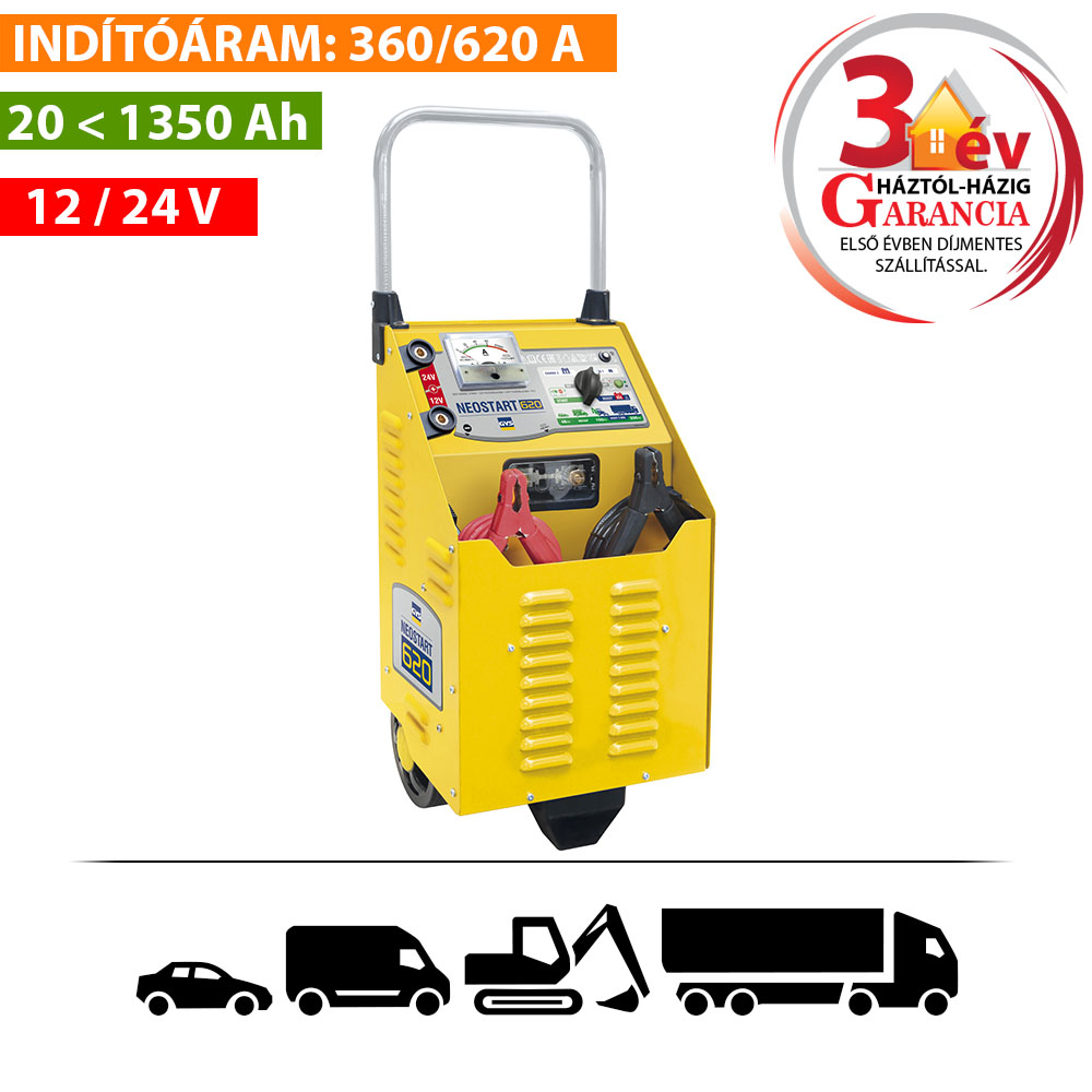 A Neostart 620 készülék folyékony elektrolittal töltött 20 Ah - 1350 Ah kapacitású, 12 V-os és 24 V-os ólomakkumulátorok töltésére alkalmas. Ez a készülék hagyományos akkumulátortöltő, a feltöltöttségi szintet figyelni kell rajta.
